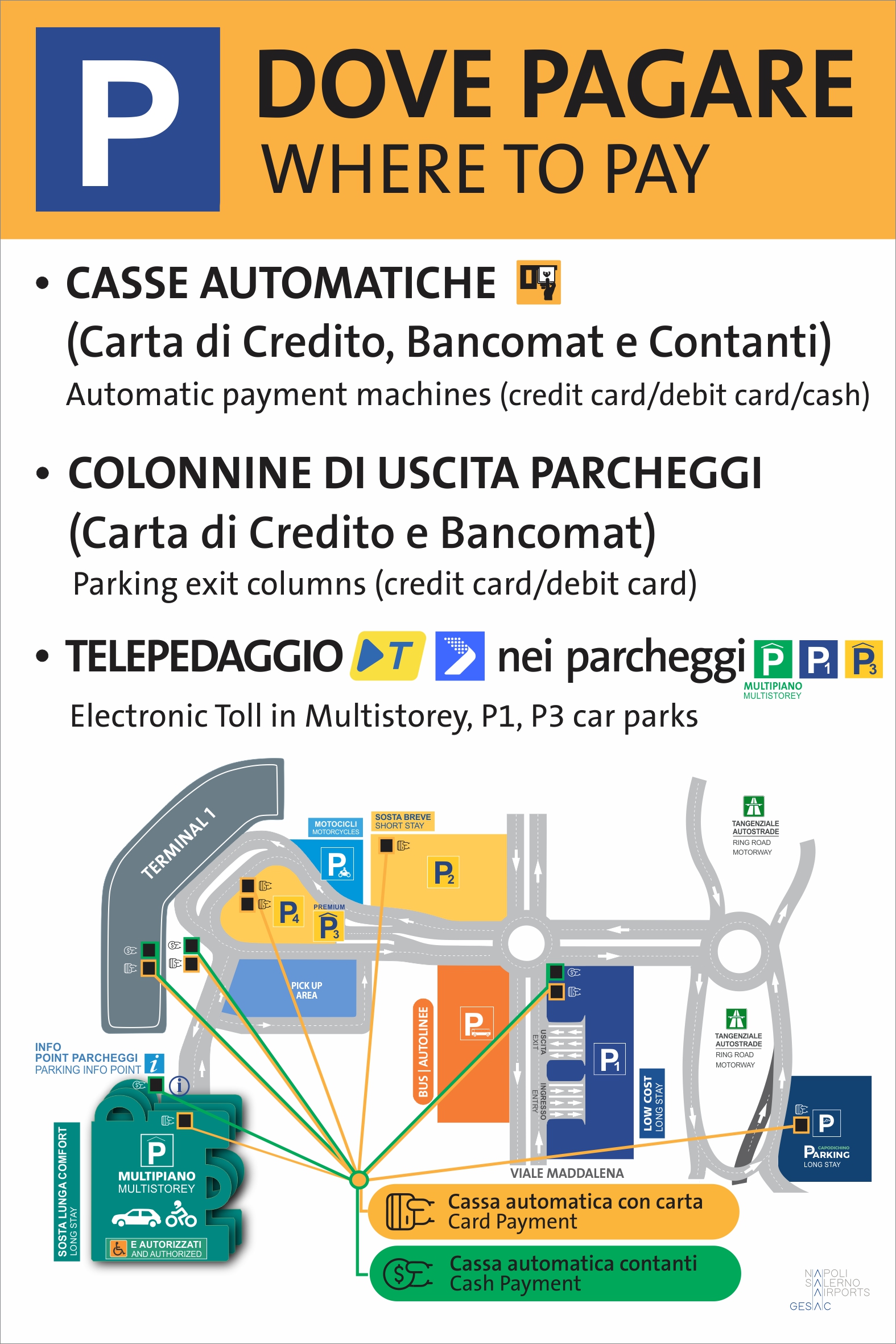 Notice: should you stay in the car park longer than the scheduled time, you can pay the additional charge by credit card at the exit gate or by cash or debit card at the Parking Info Point located on the ground floor of Multipiano Parking.
