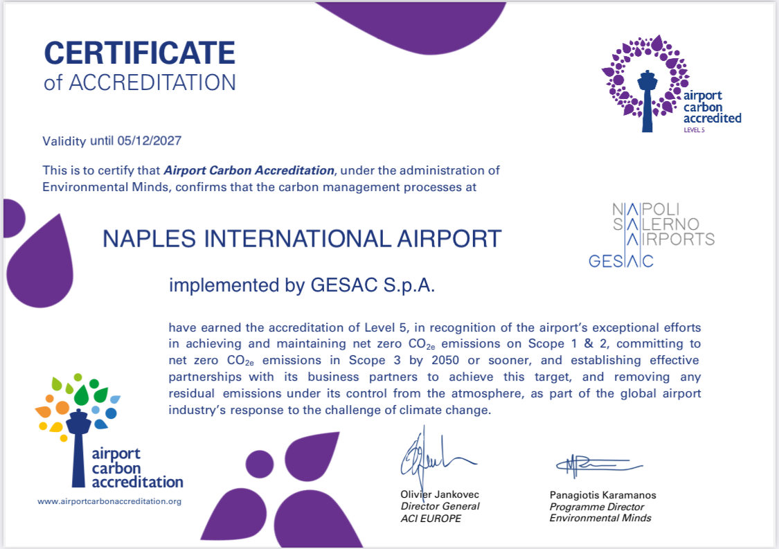 L’Aeroporto di Napoli, primo in Italia ad aver ottenuto nel 2024 l’ACA 5, ha ricevuto, anche quest’anno, la massima certificazione ambientale dell’Airport Carbon Accreditation (ACA), il programma di certificazione globale per la gestione delle emissioni di carbonio per gli aeroporti riconosciuto a livello istituzionale.